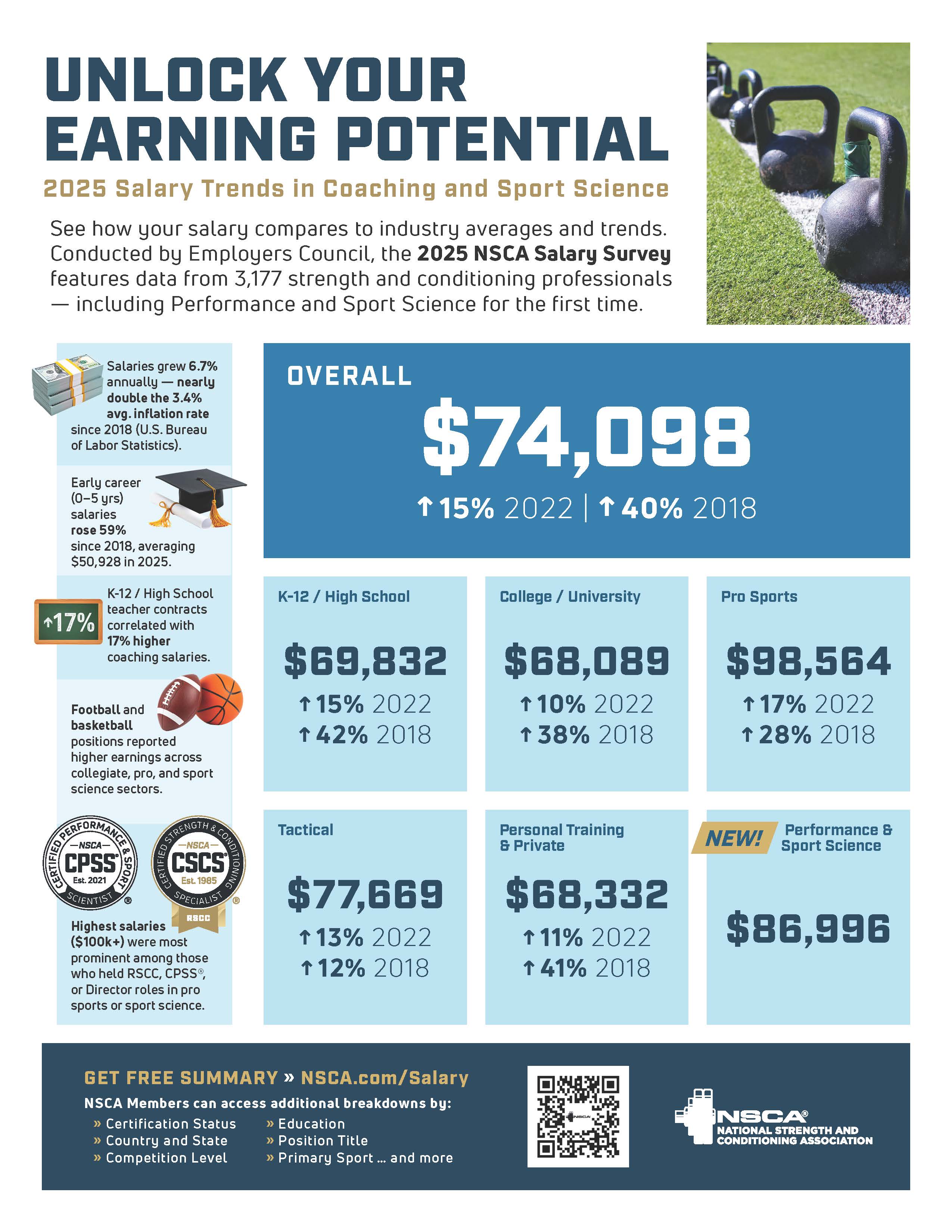 Compensation in strength and conditioning varies by setting, experience, education, and role. The 2025 NSCA Salary Survey shows competitive earning potential and strong growth across the field.